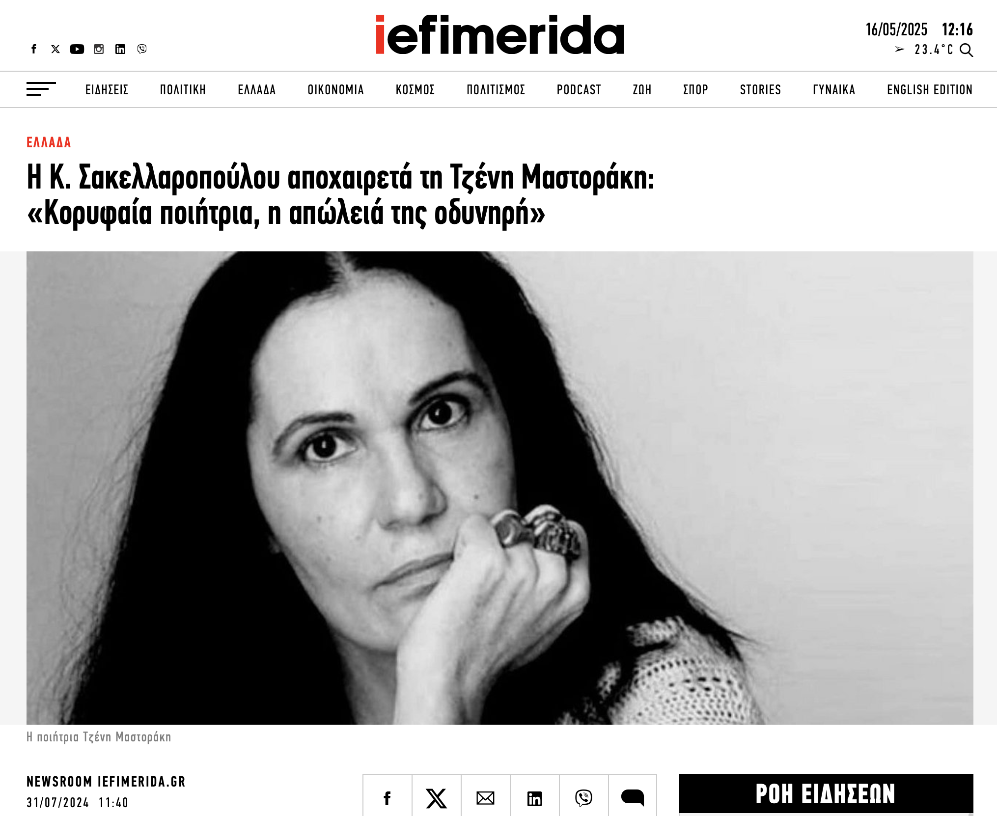 Πέθανε η σπουδαία ποιήτρια Τζένη Μαστοράκη