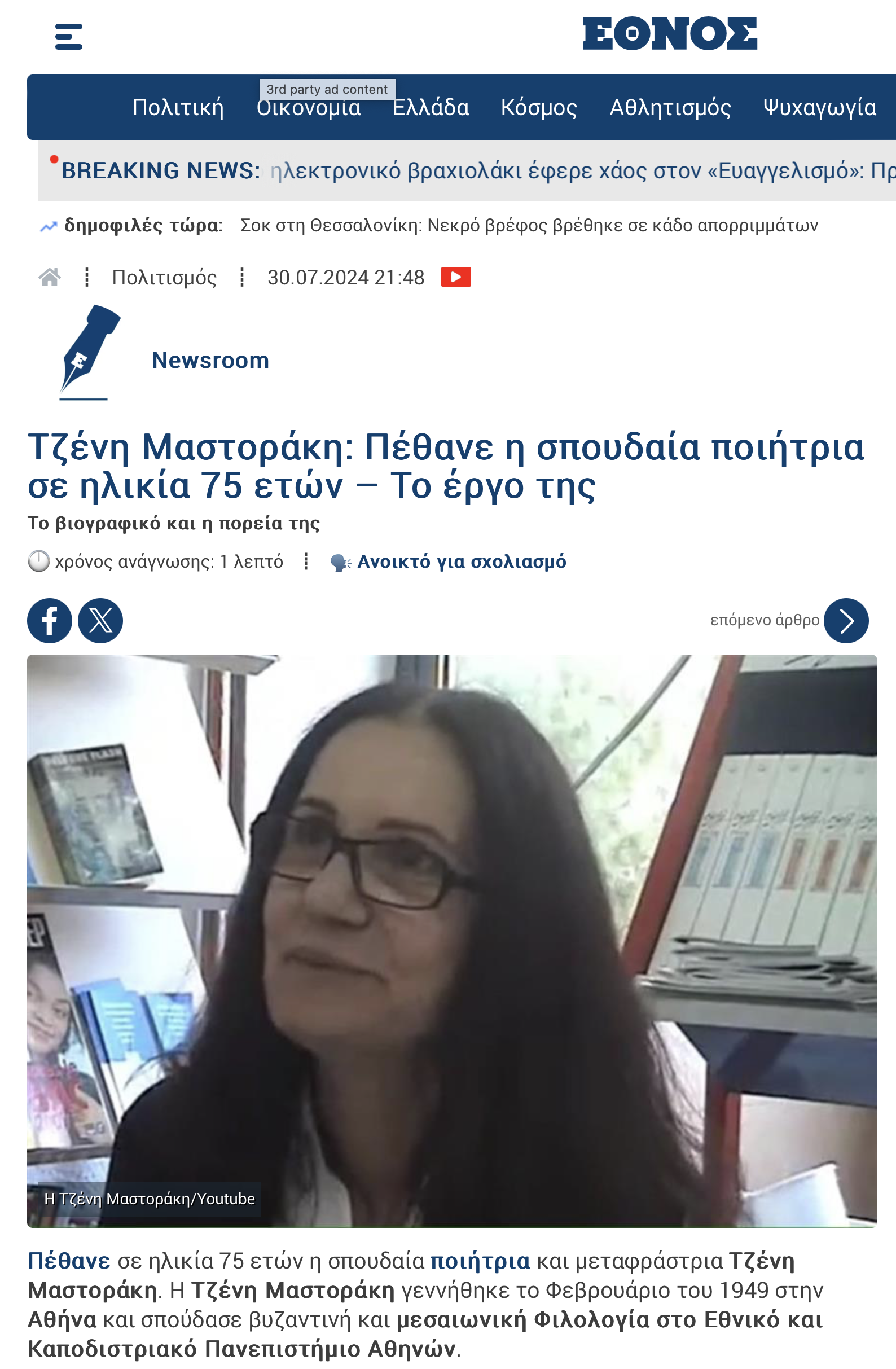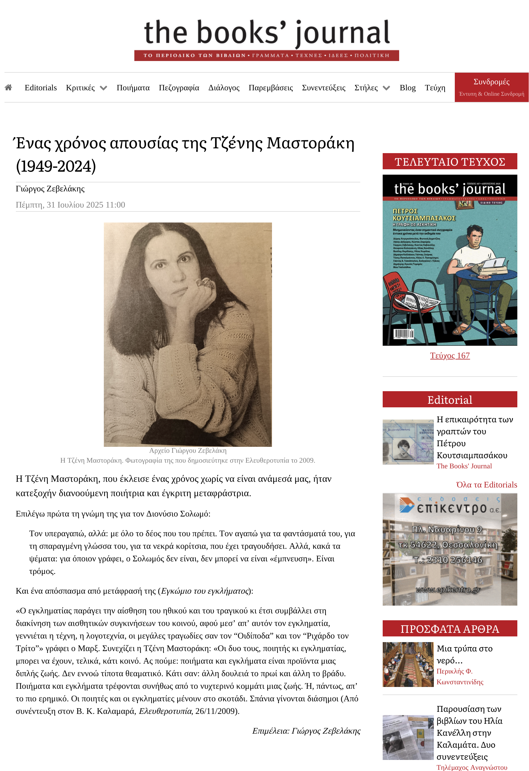 Πέθανε η σημαντική ποιήτρια και μεταφράστρια Τζένη Μαστοράκη (1949-2024) – η πορεία της, το έργο της, πρώτες αντιδράσεις. Γράφει ο Διονύσης Μαρίνος